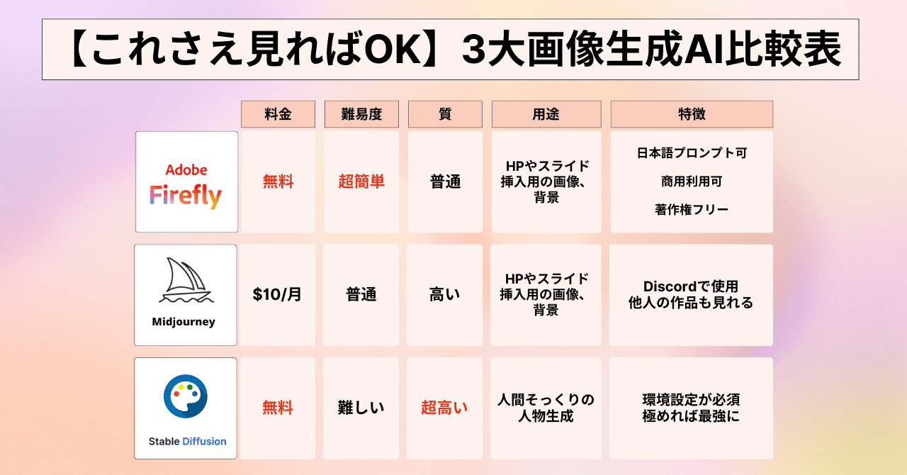 Midjourneyを始め、Adobe FireflyやStable DiffusionなどのAI画像生成ツールがたくさん出ている中、どれを使えばいいのか悩みますよね。