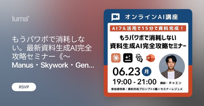 資料作成でAI未使用は機会損失すぎる。ChatGPT、Claudeで自社データ+ネット検索でのリサーチ。その後Manus、Genspark、Marpで資料作成。デザイン・ロゴの固定化、画像挿入も可能。これらのツールを全課金し徹底検証した私が「資料生成AIの極意」を2時間で解説。初心者歓迎 ⬇️参加登録(先着200名)↓